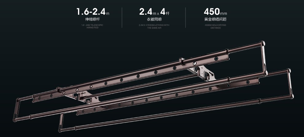 晾衣机最核心的功能,当然是晾晒。一般晾衣机的配置是4根晾杆(2根晾衣杆,2根晾被杆)。