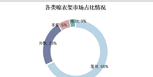 晾衣架一般可分为落地、外飘、手摇和电动四种。其中落地式晾衣架是目前最主要的产品,其市场份额占比近七成。主要是由于落地式晾衣架占地面积较小,便于移动和折叠,价位不高,而且通常与其他类型晾衣架搭配使用,所以落地式晾衣架深受大众喜欢。