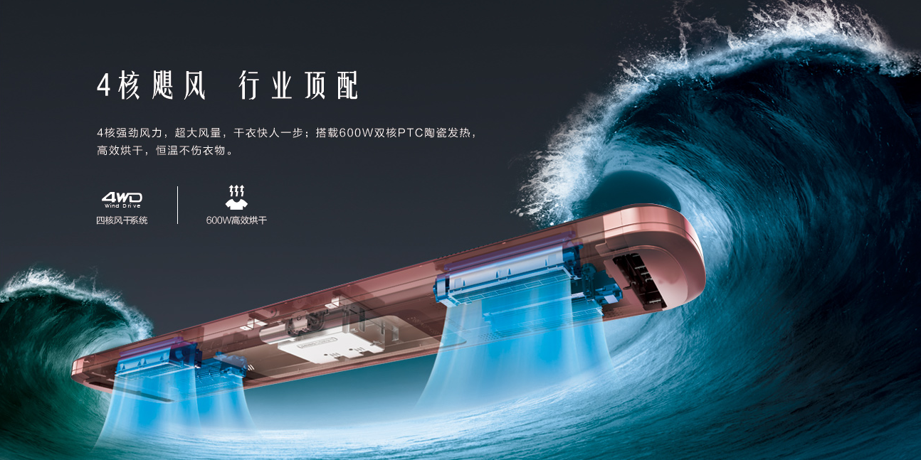 自主研发第三代动力系统,最大承重可达50KG。超强4核飓风,超大风量,搭载600W双核PTC陶瓷发热,高效烘干。